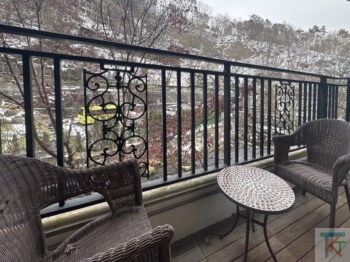 窓の外には雪のちらつき、蓼科の山々が聳えています。