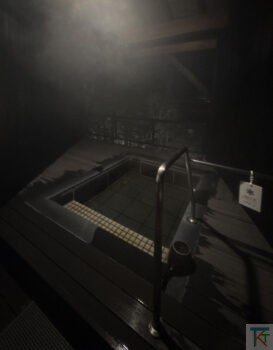 こちらは浴室手前の待ち合い空間ですが、落ち着いた雰囲気の優雅なデザインがとても魅力的でした。