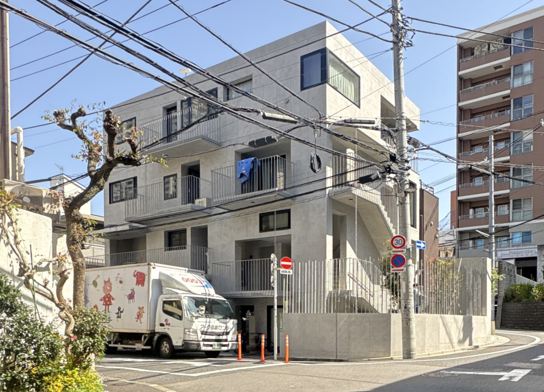 コンクリートの端正な外装と半透明の工事手すりが特徴的な建物は、バルコニーを兼ねた共用廊下によって一般的なワンルームマンションにはないセミパブリックな空間がつくられているのが大きな特徴。