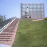 この建物は「フォーラム」と呼ばれる低層部の市民利用スペースと高層のタワーとで構成され、その2つがなだらかな丘(広場)によって繋がれているのが大きな特徴。