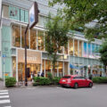建物の壁面ガラスに広場が映し出されて建物の内部まで広場が広がっているように見えるデザインなど、木以外の素材の使い方も注目です。
