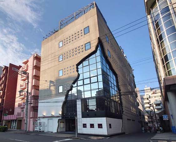 この時期の鈴木エドワード氏は原宿の「ウェッジ」や代官山の「オンワード代官山」などでも亀裂がはいったようなデザインや素材がめくれるようなデザインをしていますが、亀裂の大胆さとしては恵比寿EastGalleryが一番大きいです。