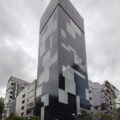 目前にある首都高に呼応するような水平スラブと、リズミカルに並ぶ住戸の境壁が特徴的な建物です。