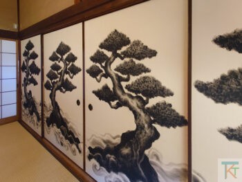 落ち着いた雰囲気中に、いぶし銀のように鈍く輝く柱や欄間、迫力の襖などが空間を演出しています。